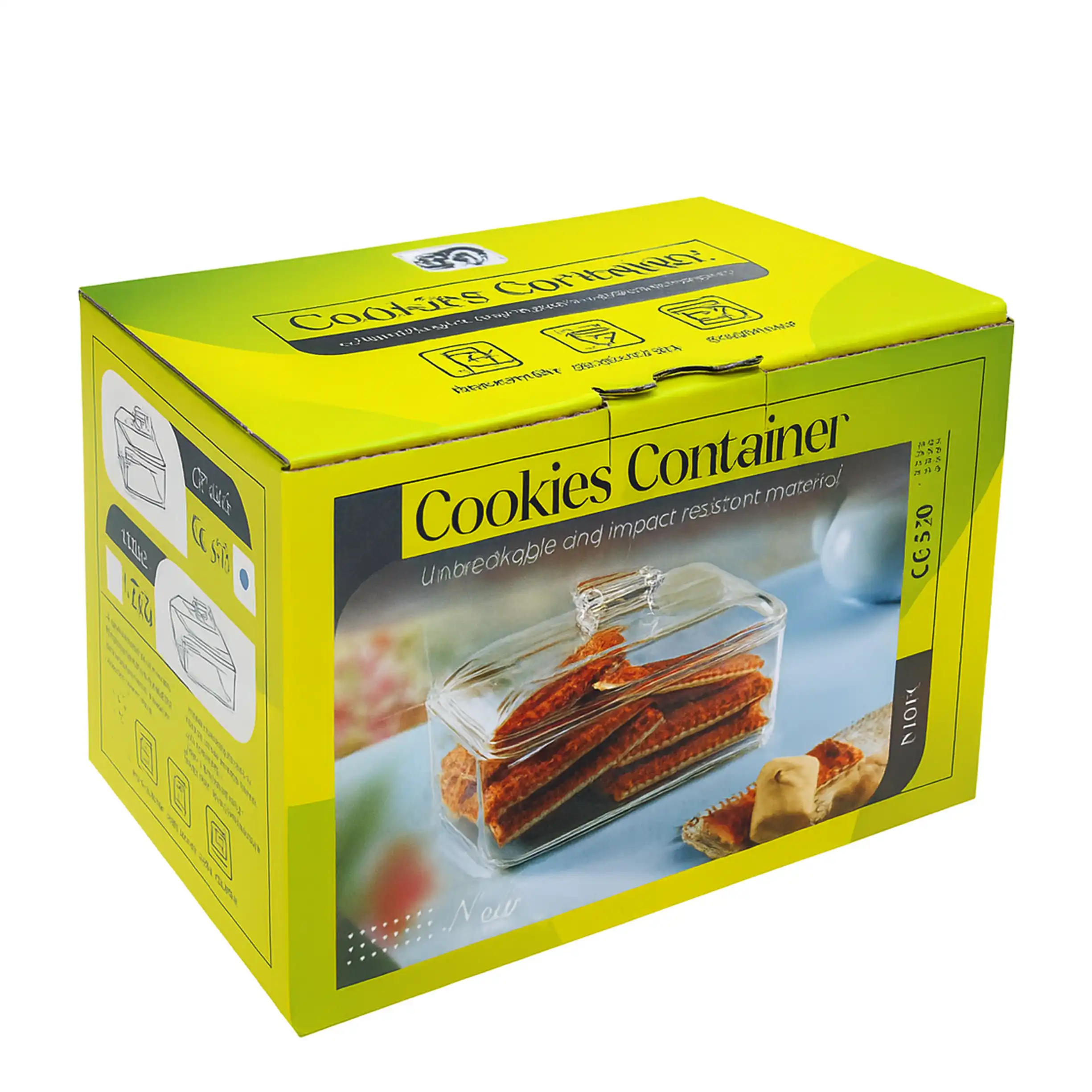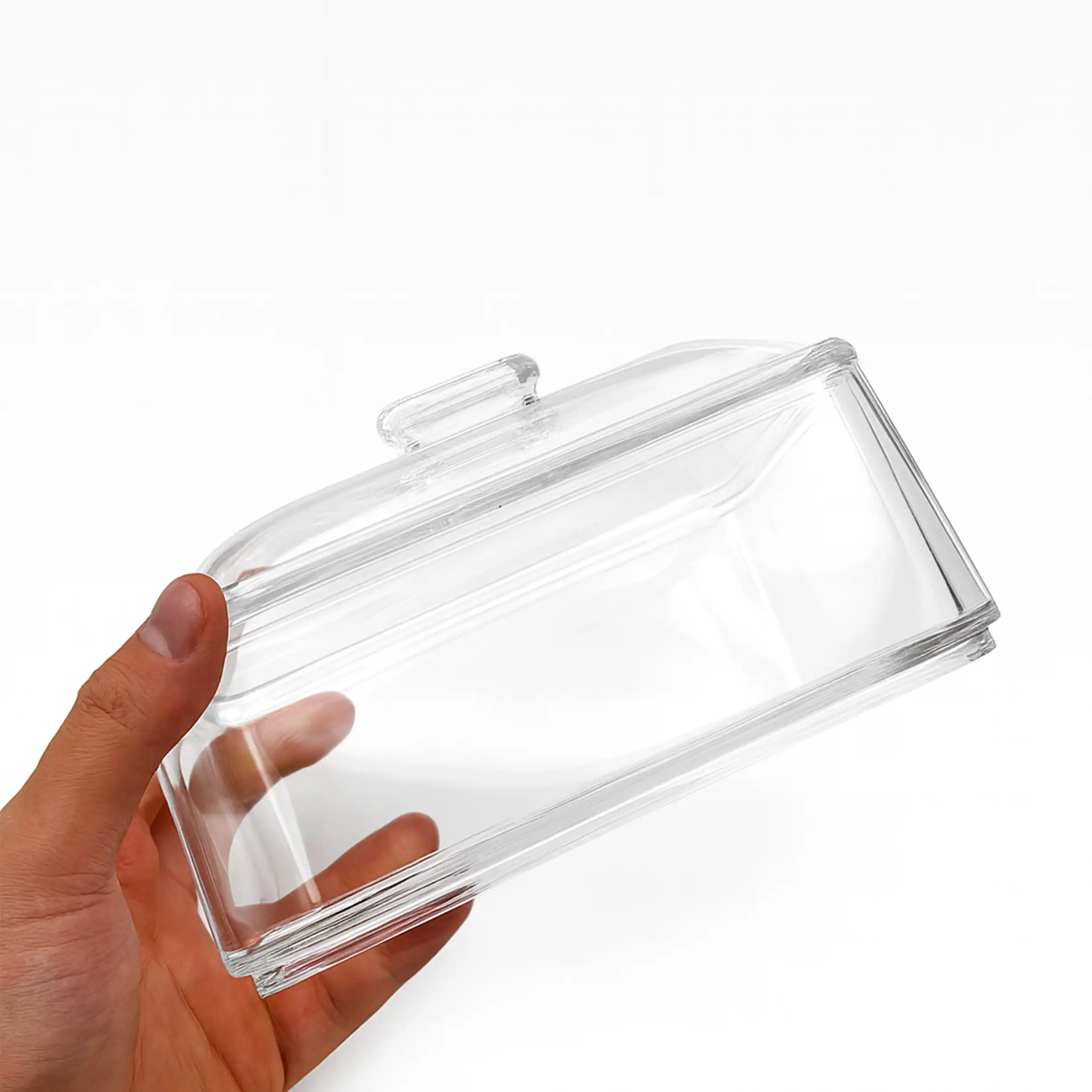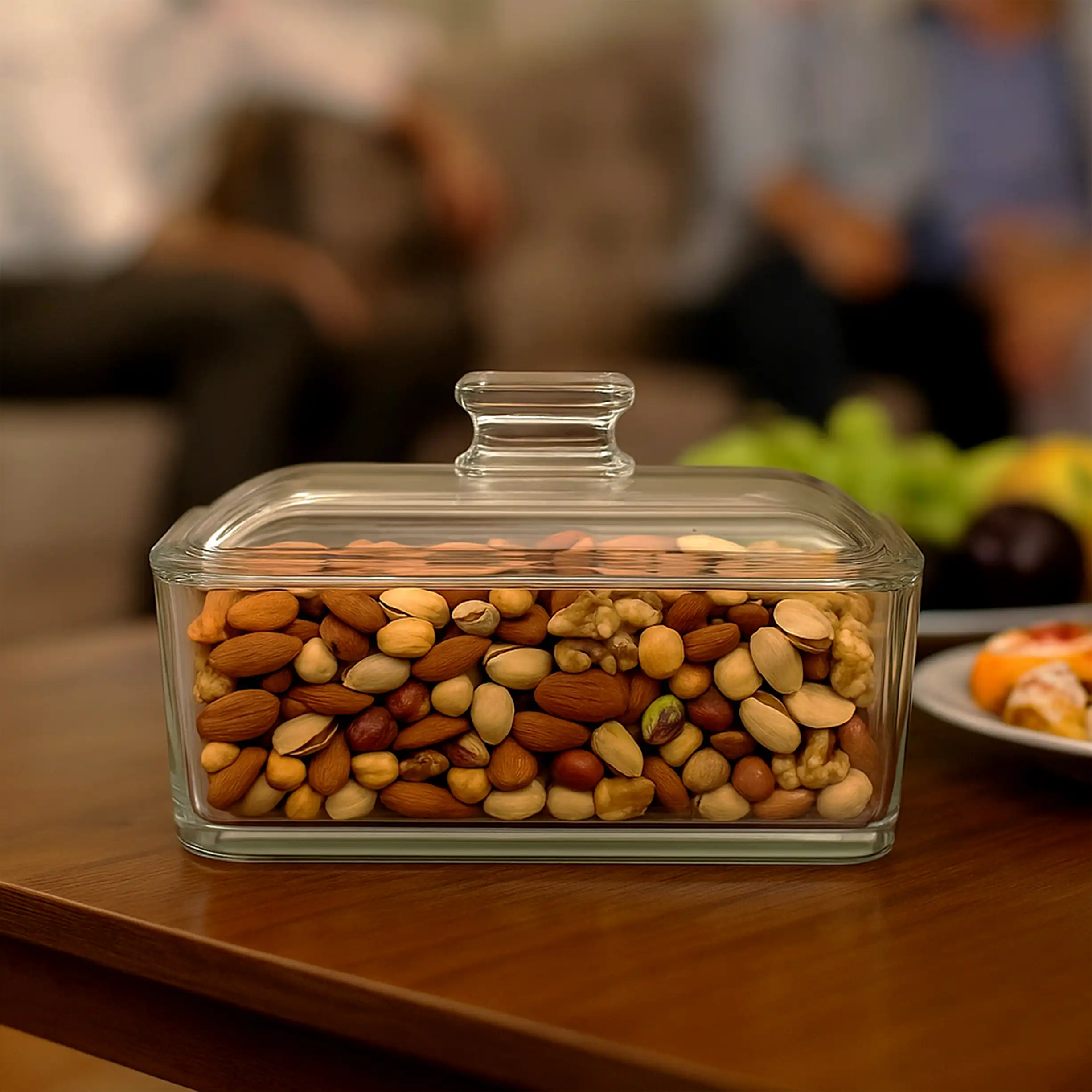 درب این ظرف به شکل هندسی و متفاوت طراحی شده تا بهراحتی باز و بسته شود و در عین حال جلوهای خاص روی میز پذیرایی ایجاد کند. گوشههای محصول بهصورت گرد و امن طراحی شده تا هم شیک باشد و هم خطر شکستگی یا لبپر شدن نداشته باشد.